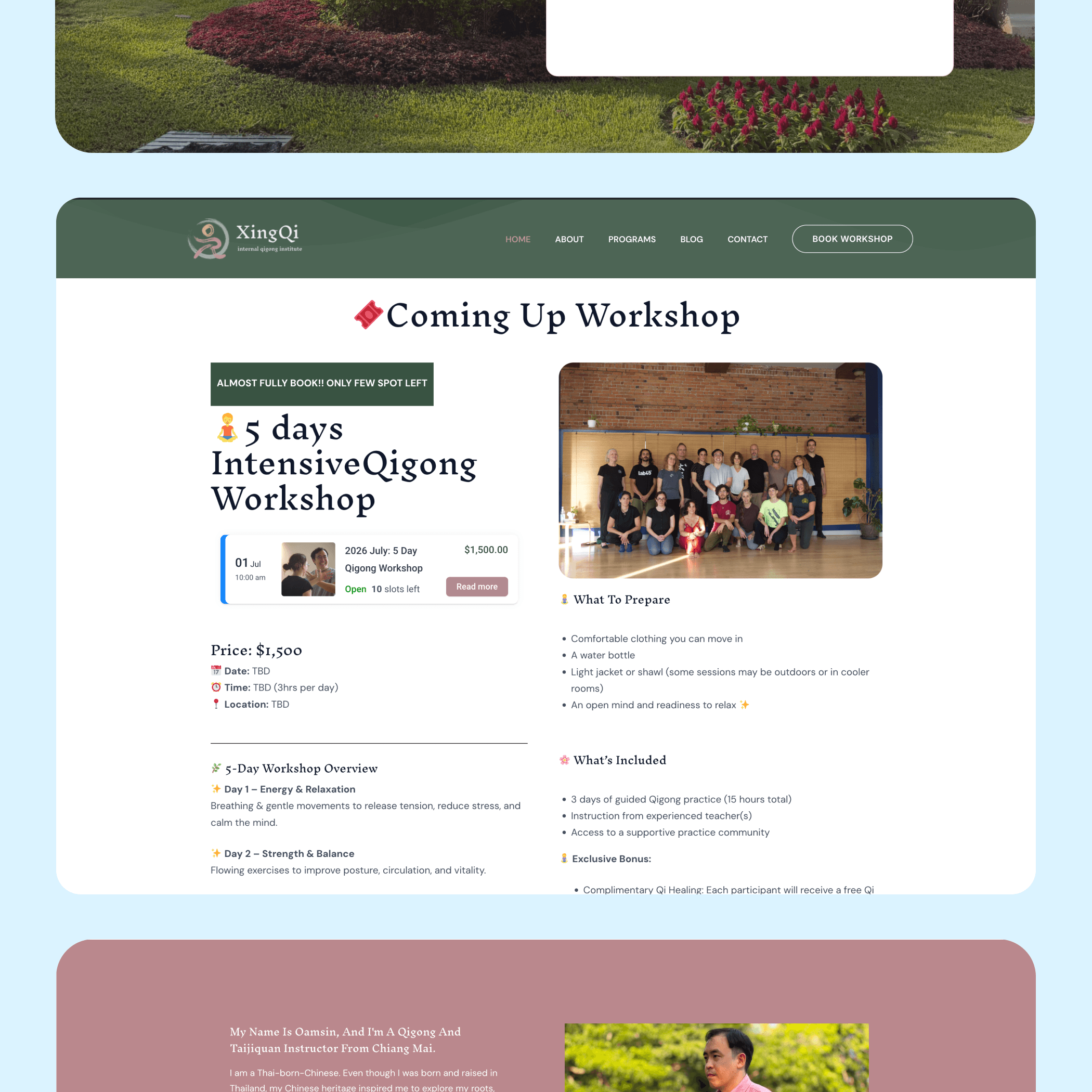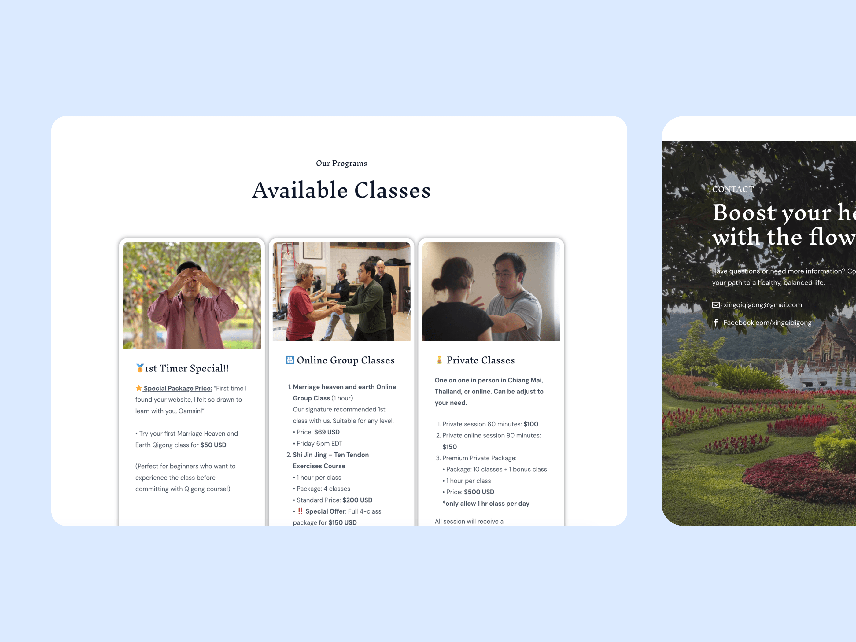 ★ The new website significantly improved the booking experience, making it easier for users to schedule classes and contact the instructor compared to the previous phone-only system — which had been especially limiting for overseas clients. ★ By expanding accessibility and streamlining enquiries, the platform contributed to a ~50% increase in traffic and class enquiries post-launch!! ★ Implementing an integrated booking system for the first time was a valuable end-to-end learning experience, spanning UX design, tooling research, and real-world implementation. ★ Working within tight budget constraints required strategic decision-making and continuous exploration of cost-effective solutions. I ultimately selected the Amelia WordPress booking plugin, which balanced functionality, usability, and affordability. ★ The final system supports a smooth client handoff: bookings are automated, and the client can independently manage schedules, edits, and new sessions to enable long-term scalability. Design Reflection: ★ Designing intangible concepts: Translating internal energy, healing, and mindfulness into visual form required symbolic storytelling and emotionally driven design thinking. ★ Balancing tradition & modernity: The project challenged me to preserve cultural authenticity while presenting the brand in a contemporary, globally accessible way. ★ ALWAYS Designing for new users: Many visitors were new to Qigong, so I prioritized clear explanations, gentle onboarding, and supportive content throughout the user journey.