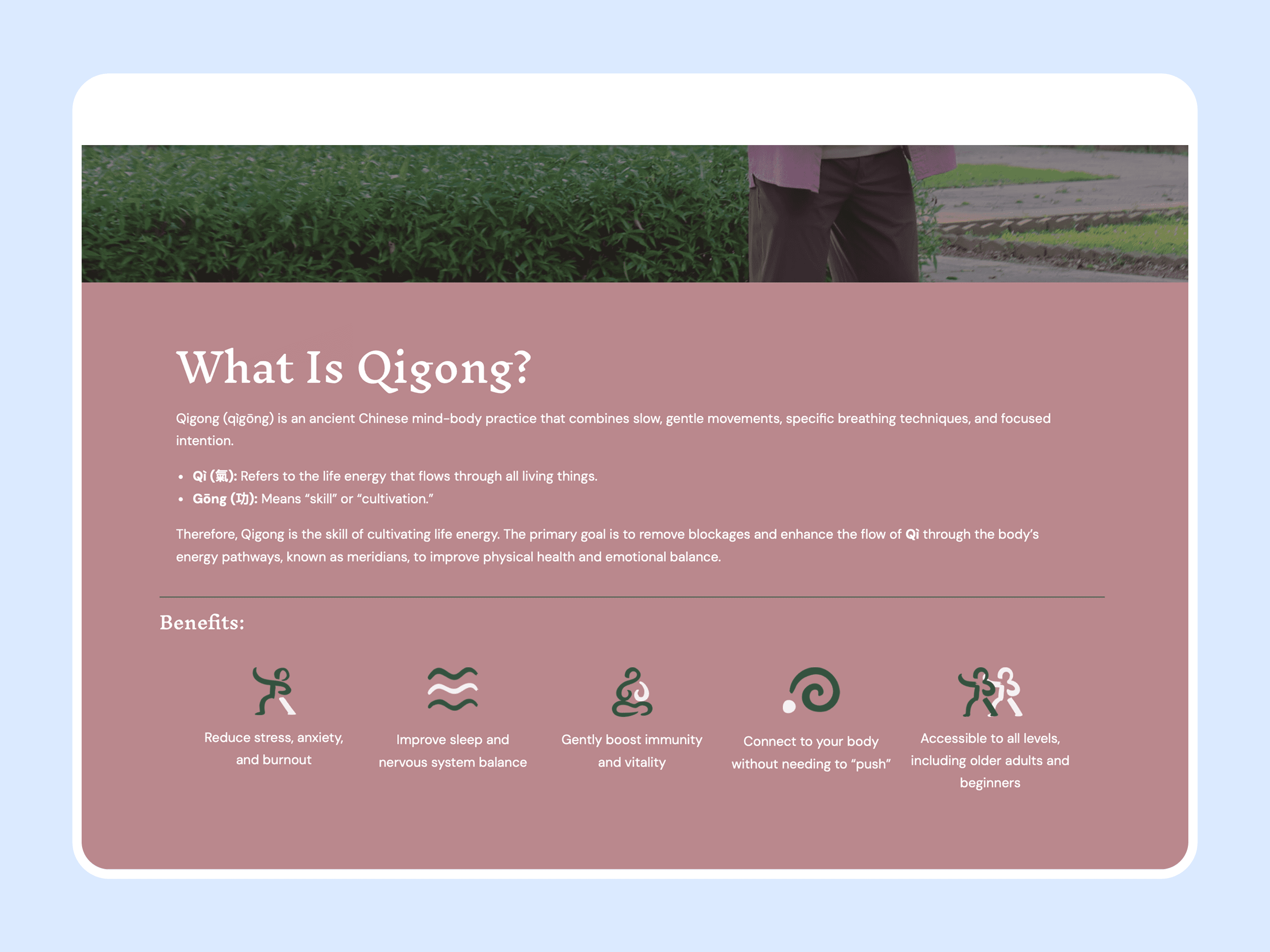 Brand Identity ★ Designed the XingQi logo inspired by brushstrokes, flowing Qi, and natural elements ★ Established a visual language reflecting calmness, internal power, and Eastern aesthetics ★ Explored symbolism such as circles, waves, mountains, and organic motion Website Experience ★ Designed the institute’s website on WordPress ★ Structured information architecture for classes, philosophy, and booking ★ Focused on clarity for users unfamiliar with Qigong Landing Page & Conversion Flow ★ Crafted messaging to resonate with burnout professionals and wellness seekers ★ Balanced educational content with emotional storytelling ★ Designed for both discovery and sign-up conversion Marketing & Class Materials ★ Created promotional visuals and supporting assets ★ Ensured consistency across online and offline touchpoints
